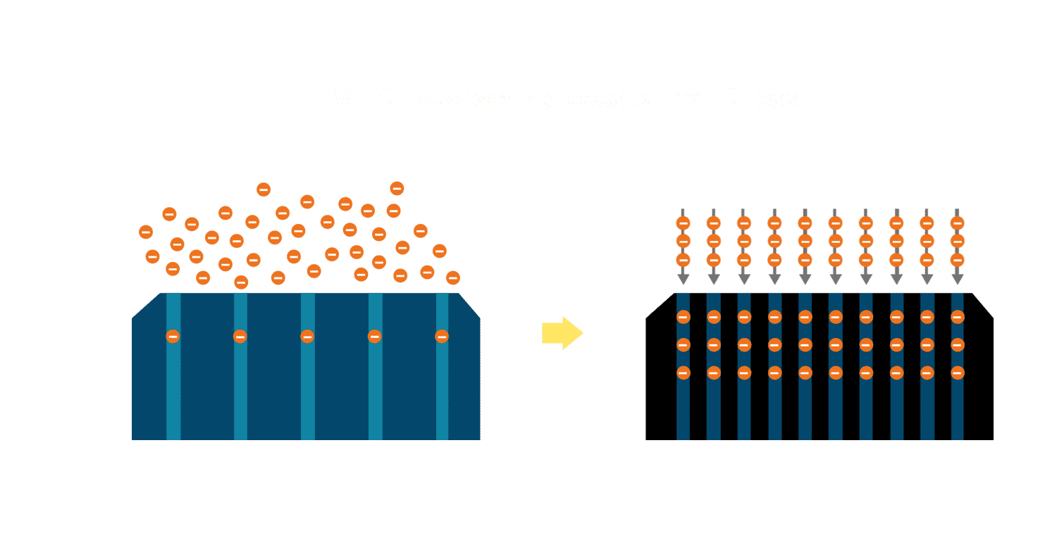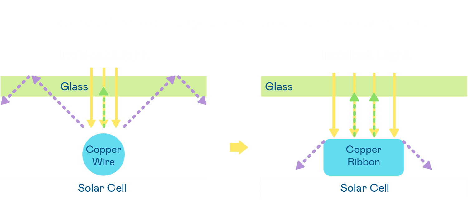 • 电池使用多条铜导线 (Copper wire) 于电池片上形成较短的电流路径,,,,提高电流收集效率,,,采用圆形设计的铜导线较传统扁平式的铜焊带 (Ribbon),,可增加入射至电池的光线量。。