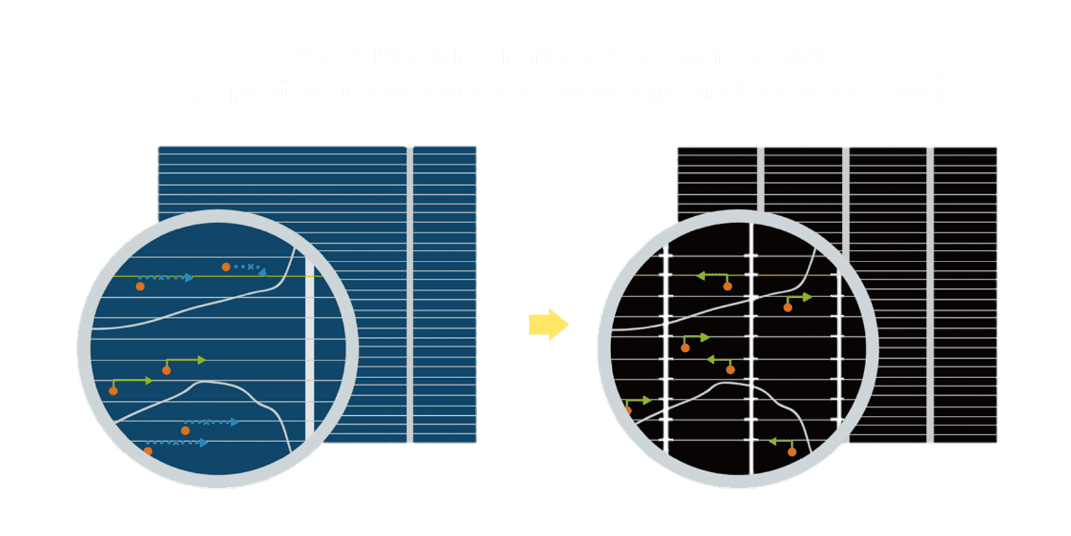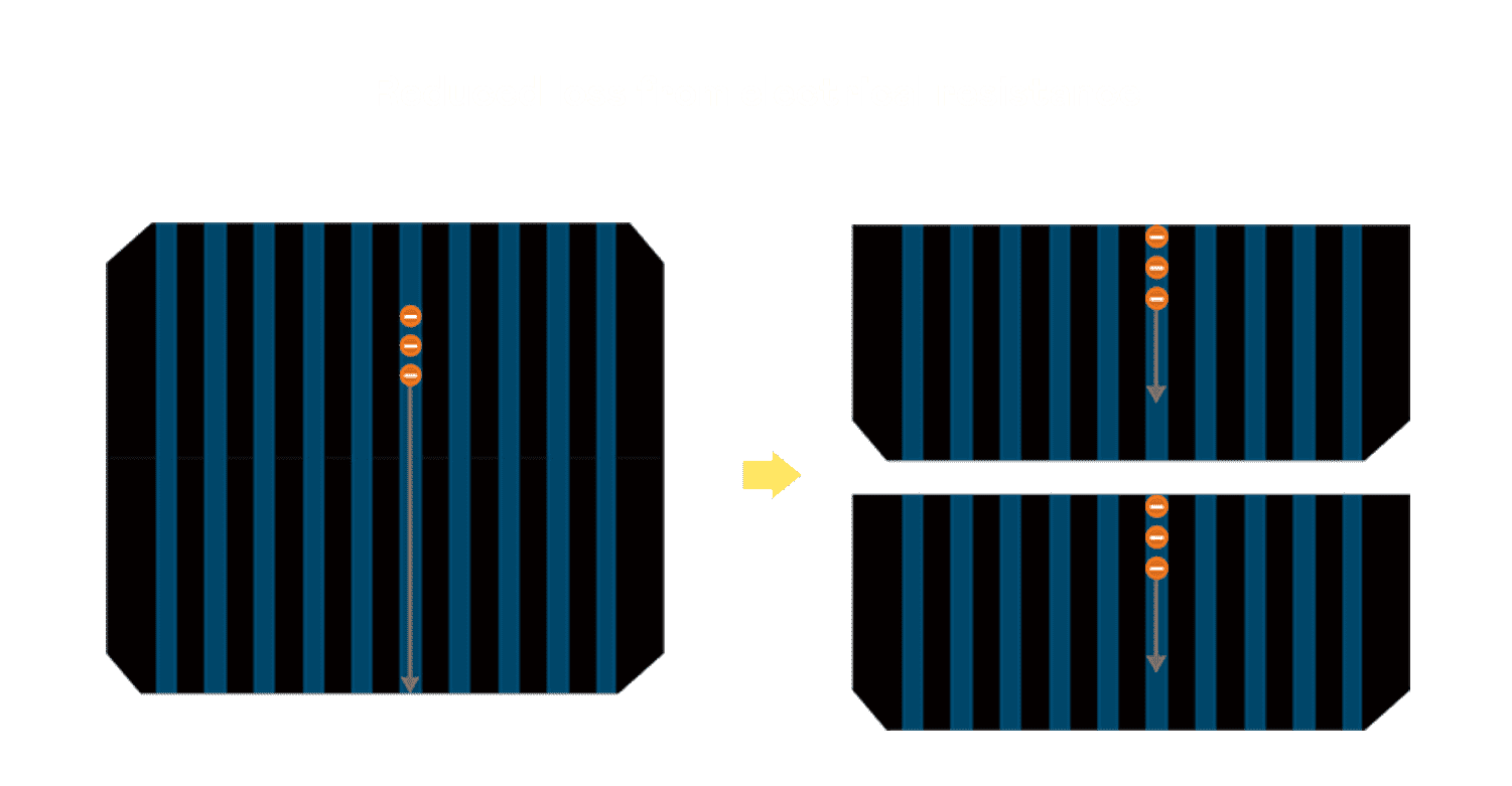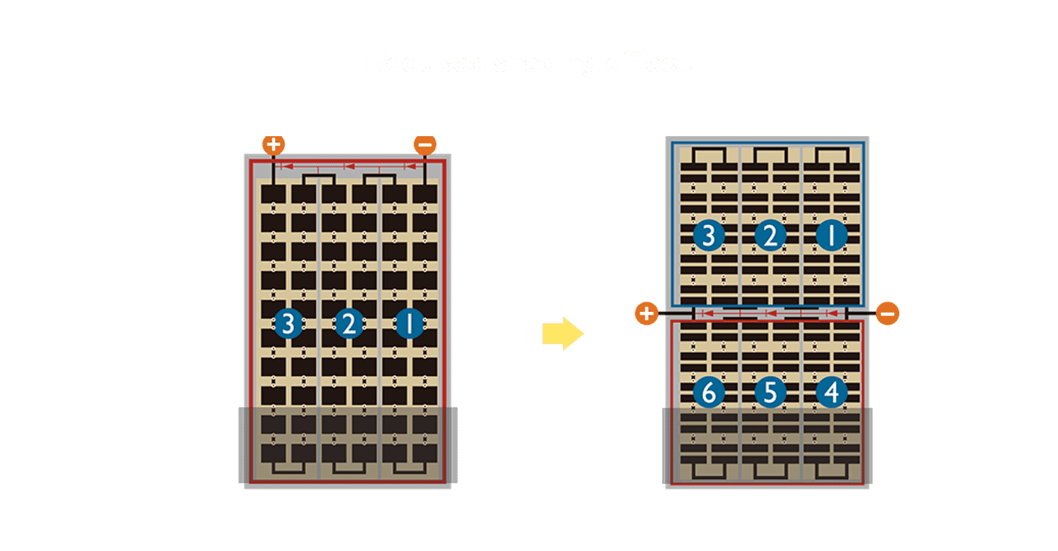 • 结合半切电池,,,降低遮阴影响、、、提升模组抗隐裂能力、、、并减少电阻损耗,,,进一步提升模组发电效能。。
